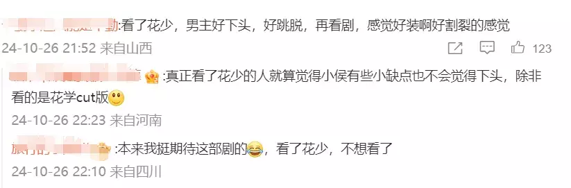 是以这剧一上,就有东谈主说:“看了花少,男主好下头,好跳脱,再看剧,嗅觉好装好割裂……”也有东谈主说:“蓝本挺期待这剧,看了花少,不想看了……”